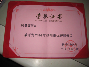近日,万杨物业服务管理有限公司保安陶富贵同志被评为2014年扬州市优秀保安。