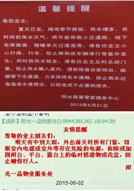 在暴雨来临之前,各小区的温馨提示遍布各个角落……