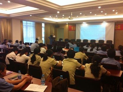 此次培训特别邀请扬州阳光职业培训学校殷老师主讲,他详细讲解了保洁流程、操作规范及与业主的沟通技巧等理论知识,并对工作和生活中的实际案例进行了分享与解析。