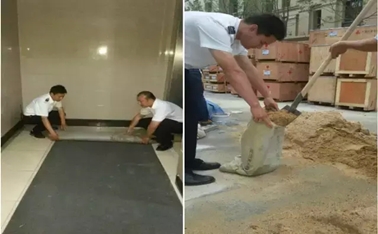 秩序维护员在电梯口铺上防滑垫,并准备好沙袋,随时最好防洪抗洪的准备
