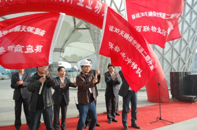 3月24日下午,上海百联物业在世博源二期项目(原世博轴)施工现场举行奋战30天确保世博源购物中心二期项目开业立功竞赛誓师大会。友谊股份总经理李雨林、百联物业总经理陈宇伟动员讲话并向百联物业冲锋队、百联物业后备队、供应商服务保障队代表授旗。