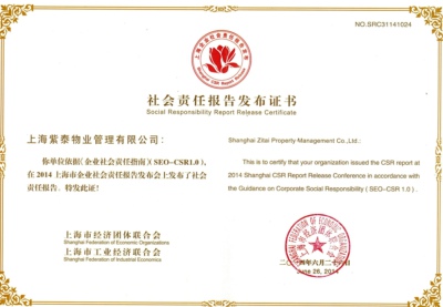 6月26日,紫泰物业在上海市经济团体联合会主办的2014上海市企业社会责任报告发布会上,连续第三年向全社会发布本企业社会责任报告。