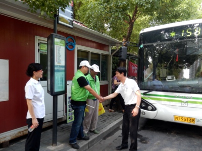 古北物业公司志愿者团队坚持每月5日、15日和25日三天的早高峰,到公交158路蓝宝石路终点站开展学雷锋交通文明岗义务执勤。志愿者们引导乘客文明排队、文明乘车,为公众提供咨询、药箱、地图、针线包和雨具等便民服务。